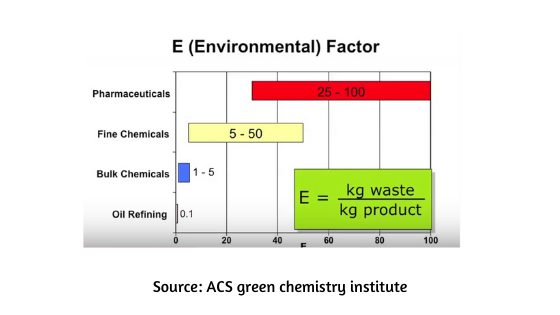 One of the important metrics of waste is the E-factor. It is the kg of waste produced per kg of product and guess which industry is the hero with the highest E-factor (thanks heaven it is not the cosmetic industry)